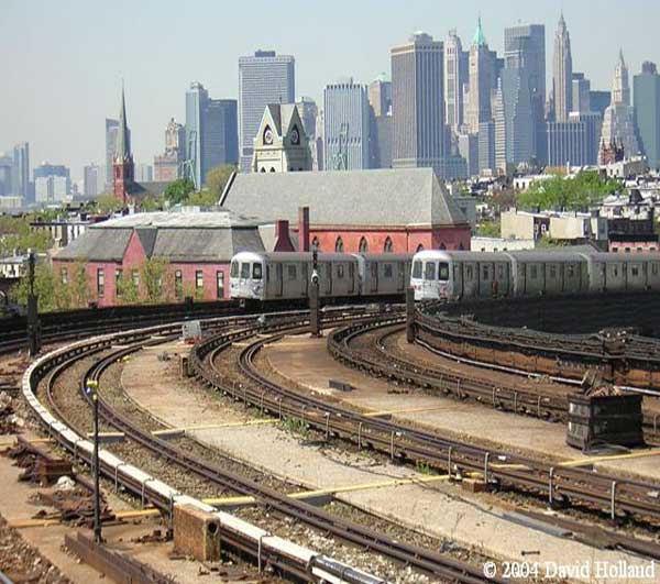 Two G trains by the Smith-9th Streets station; Resized photo courtesy of Eye On Transit